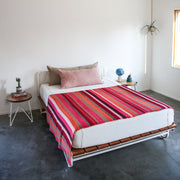 Our Khadi desert blankets are hand-spun, hand-woven cloths from India through fair trade co-ops, composed of a 90% wool weft and 10% cotton warp. Wool and cotton are first spun into yarn on a charkha, a spinning wheel, and then hand-dyed exclusively for Garza Marfa. The yarn is then woven on a handloom to produce our blankets designed by us in Marfa, Texas.