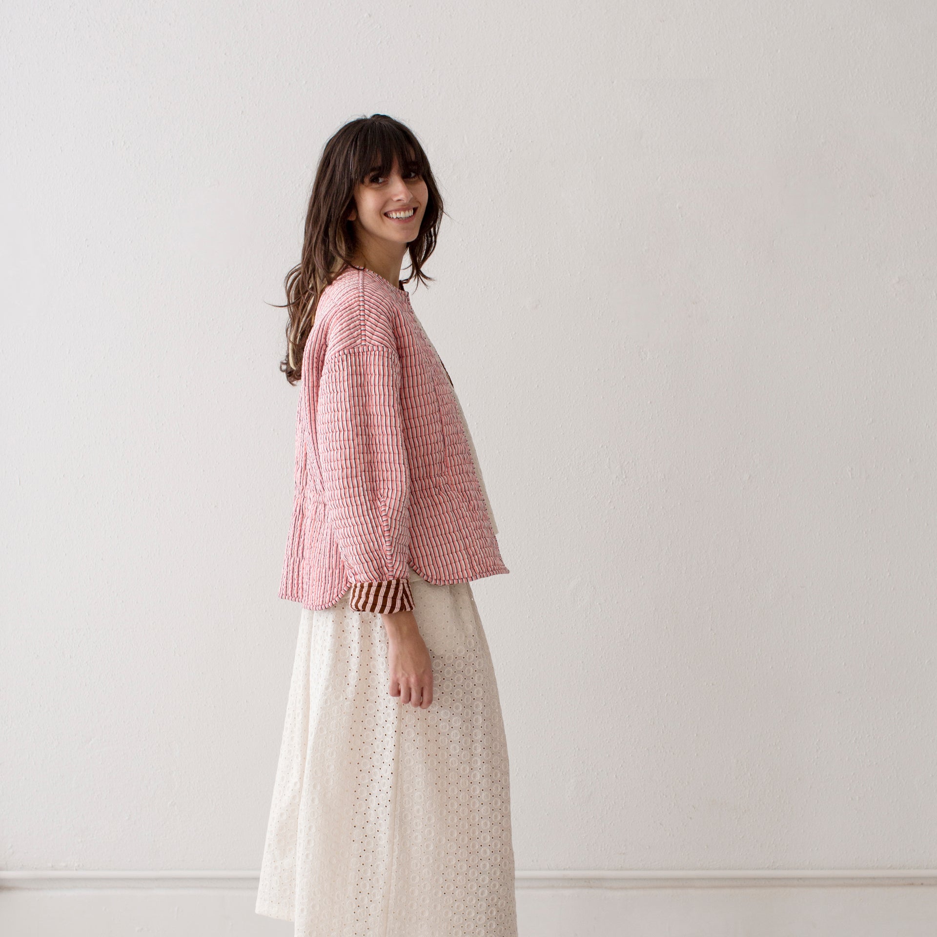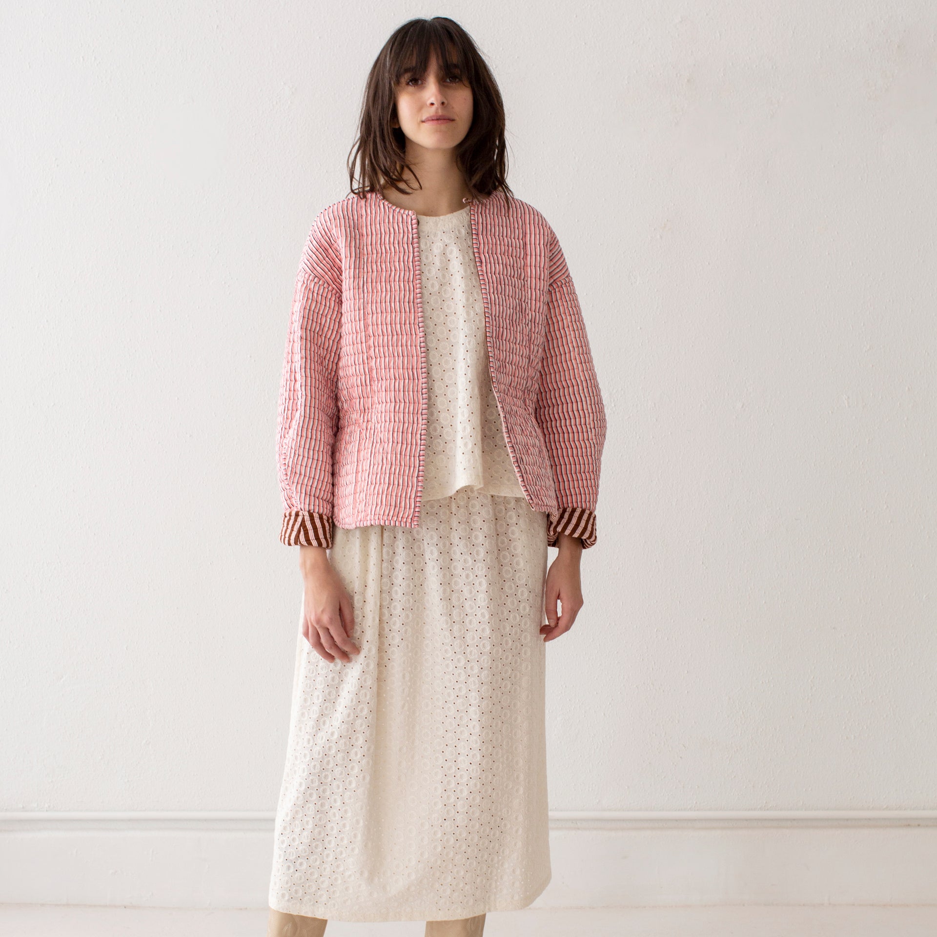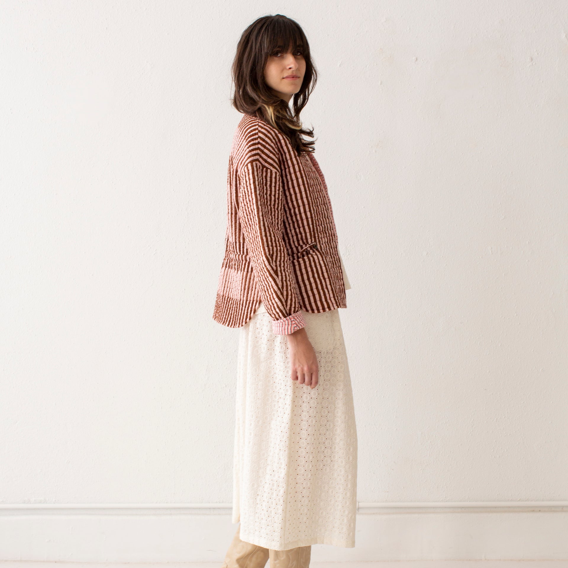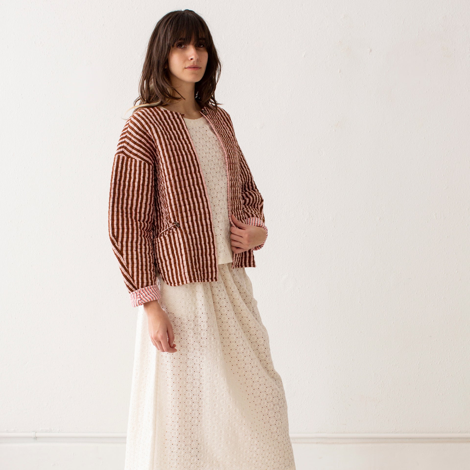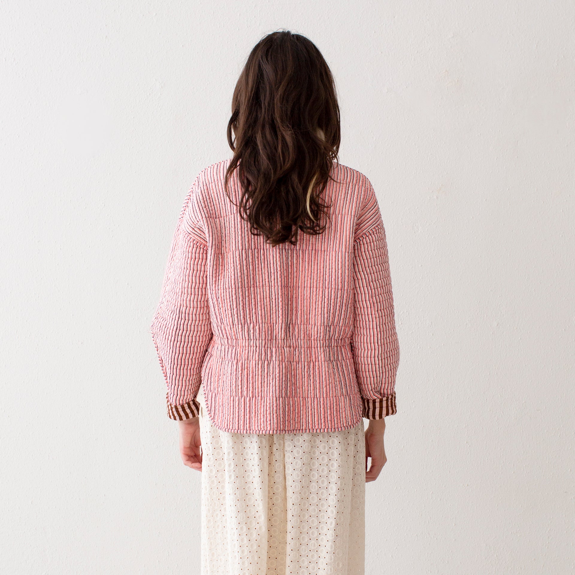 Our newest quilted jacket is fully reversible and hand block printed in India with our custom stripe design. Adjustable Drawstring gives a new cinched silhouette, plus we added pockets for a more functional year round layer. Wear either the chocolate stripe side or the apricot stripe side for a completely different vibe. Gets better as you wash, this jacket feels like your favorite comforter.