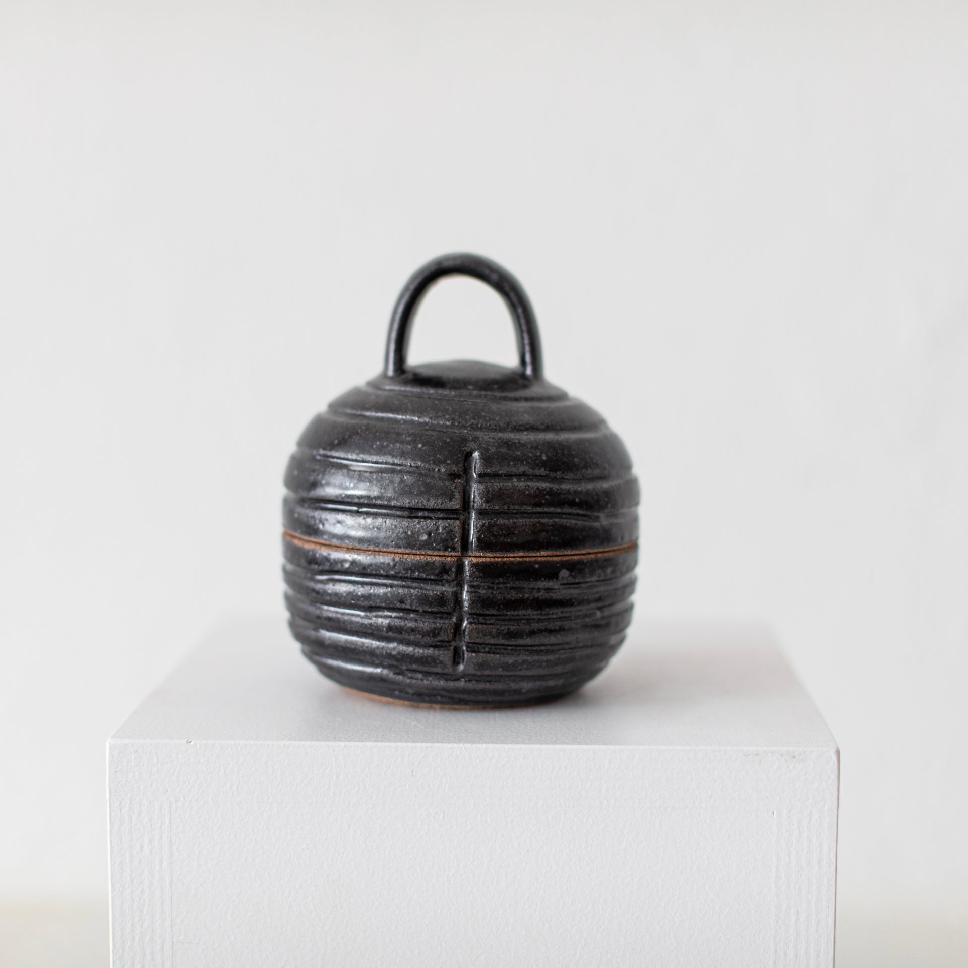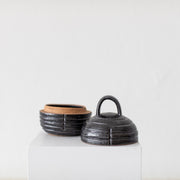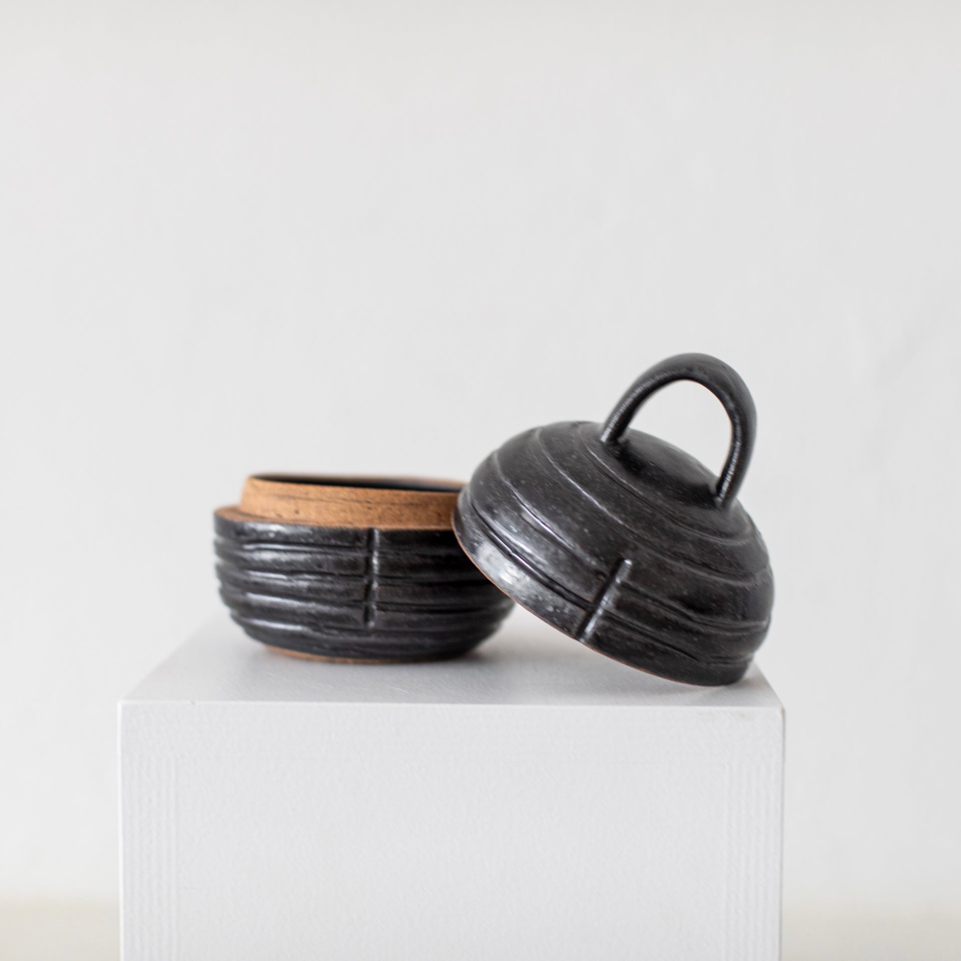 Dina Perlasca Round Lidded Jar in Charcoal with Carved Stripes