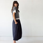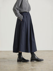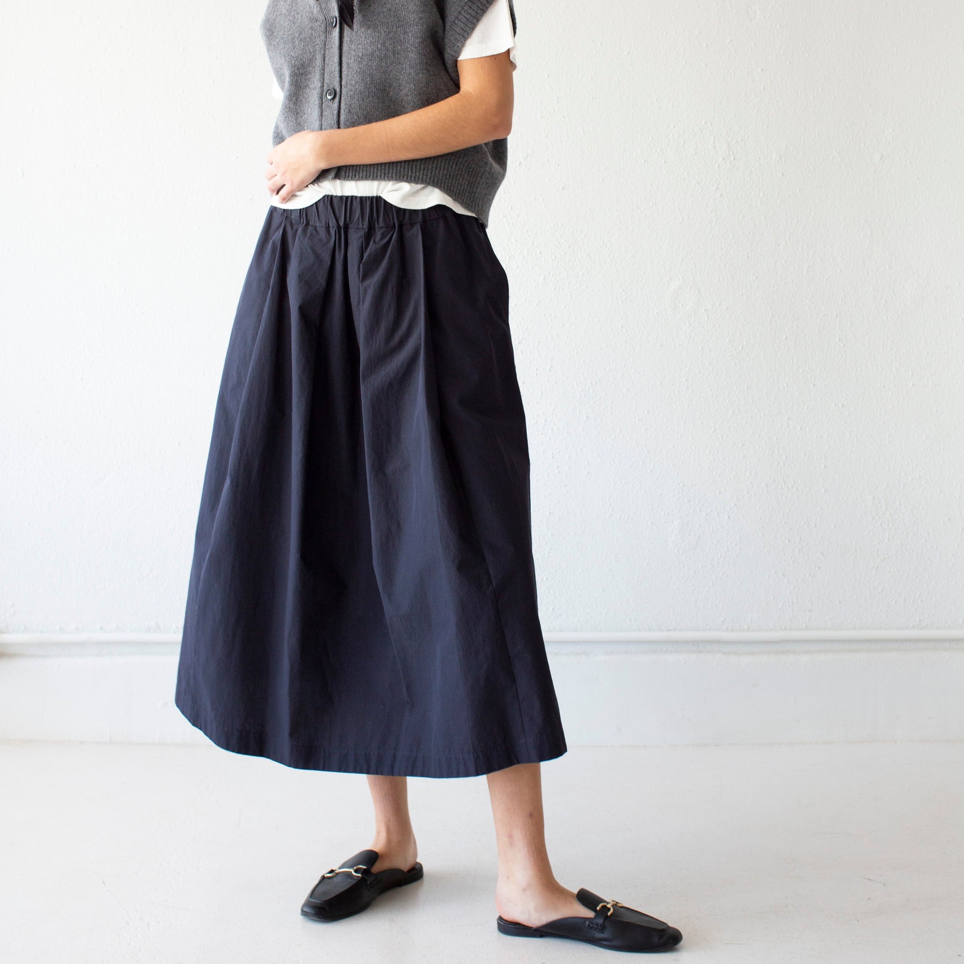 A fusion of tradition and modernity, this navy midi-length skirt from Nicholson & Nicholson feels both avant-garde and practical. Made from an airy cotton blend, with minimalist details; an A-line silhouette, elasticated waist with tonal ties, and seamless side pockets - this skirt is a joy to style and makes a great foundation to any outfit.