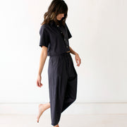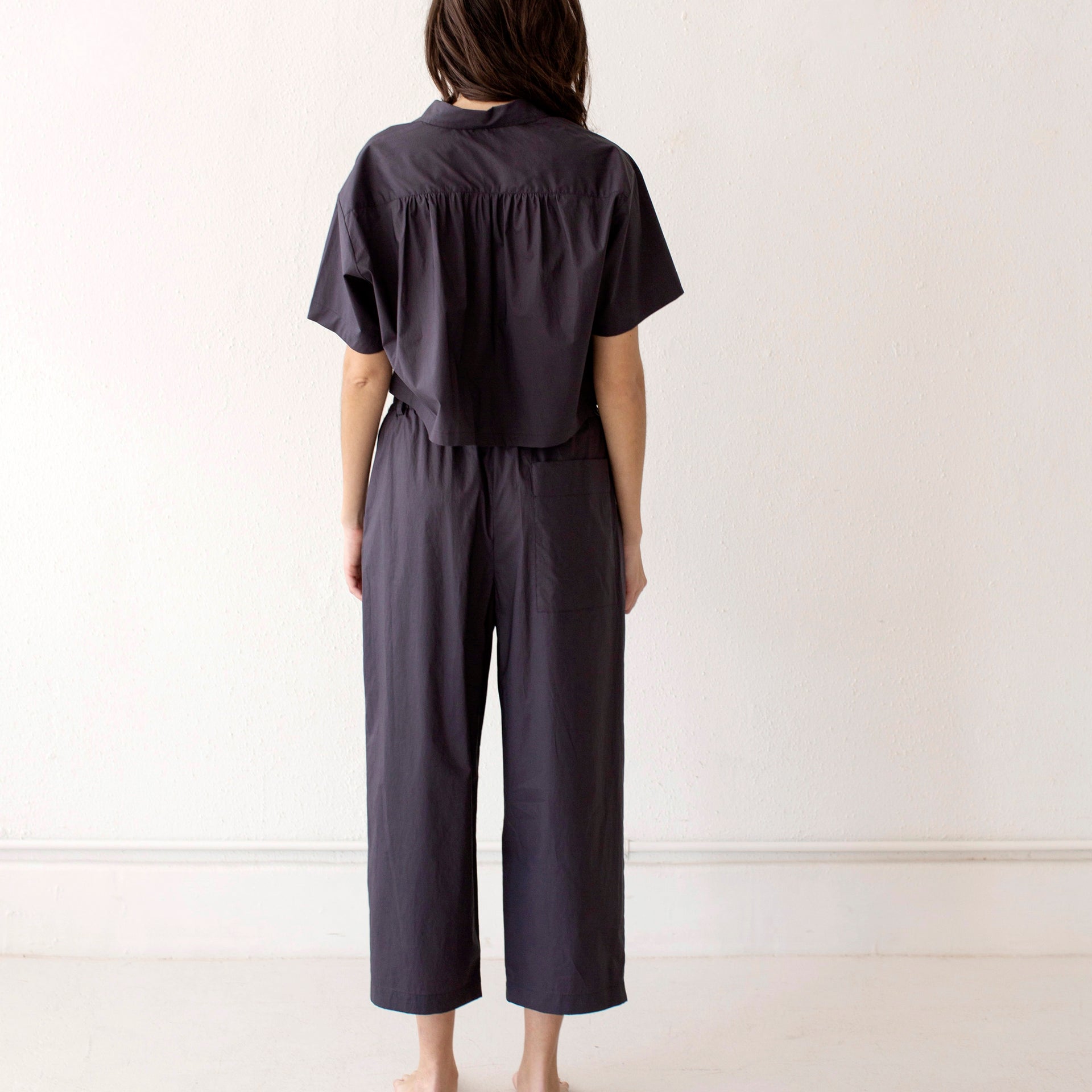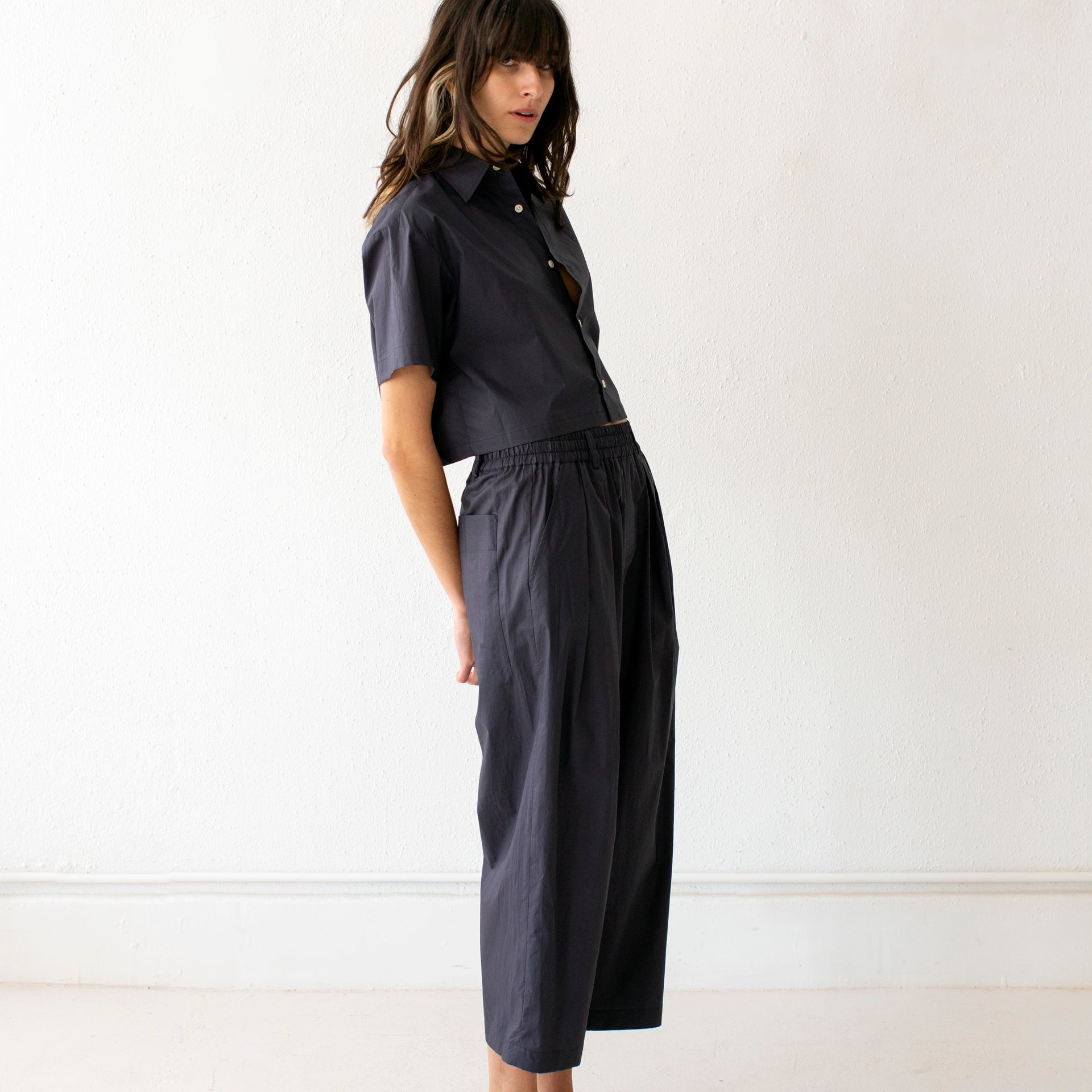 Nicholson & Nicholson's Hakama Pant is made from lightweight cotton creating a soft yet structural silhouette. These trousers feature a fitted elastic waistband with a drawstring, a wide leg with a slightly cropped length, angled side pockets, and pleats throughout.