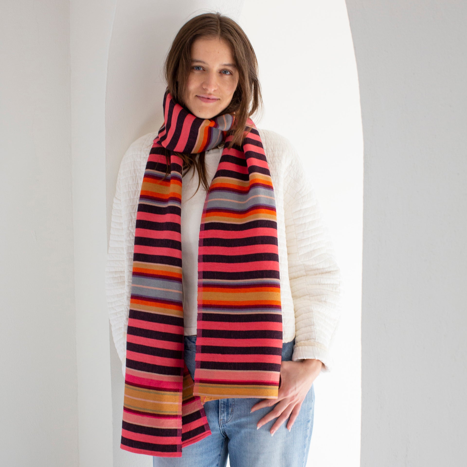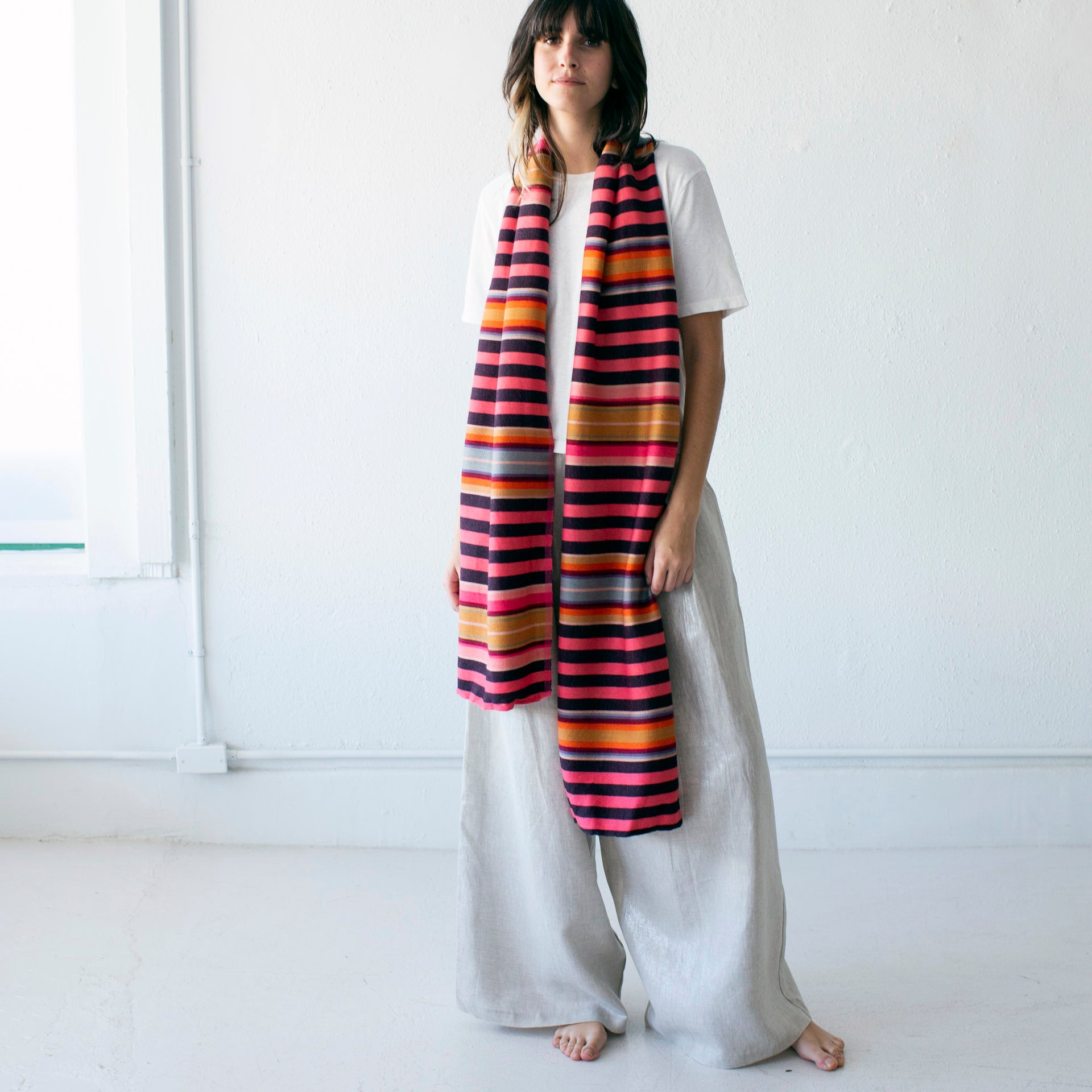 Our Khadi desert scarves are hand-spun, hand-woven cloths from India through fair trade co-ops, composed of a 90% wool weft and 10% cotton warp. Wool and cotton are first spun into yarn on a charkha, a spinning wheel, and then hand-dyed exclusively for Garza Marfa. The yarn is then woven on a handloom to produce our blankets designed by us in Marfa, Texas.