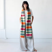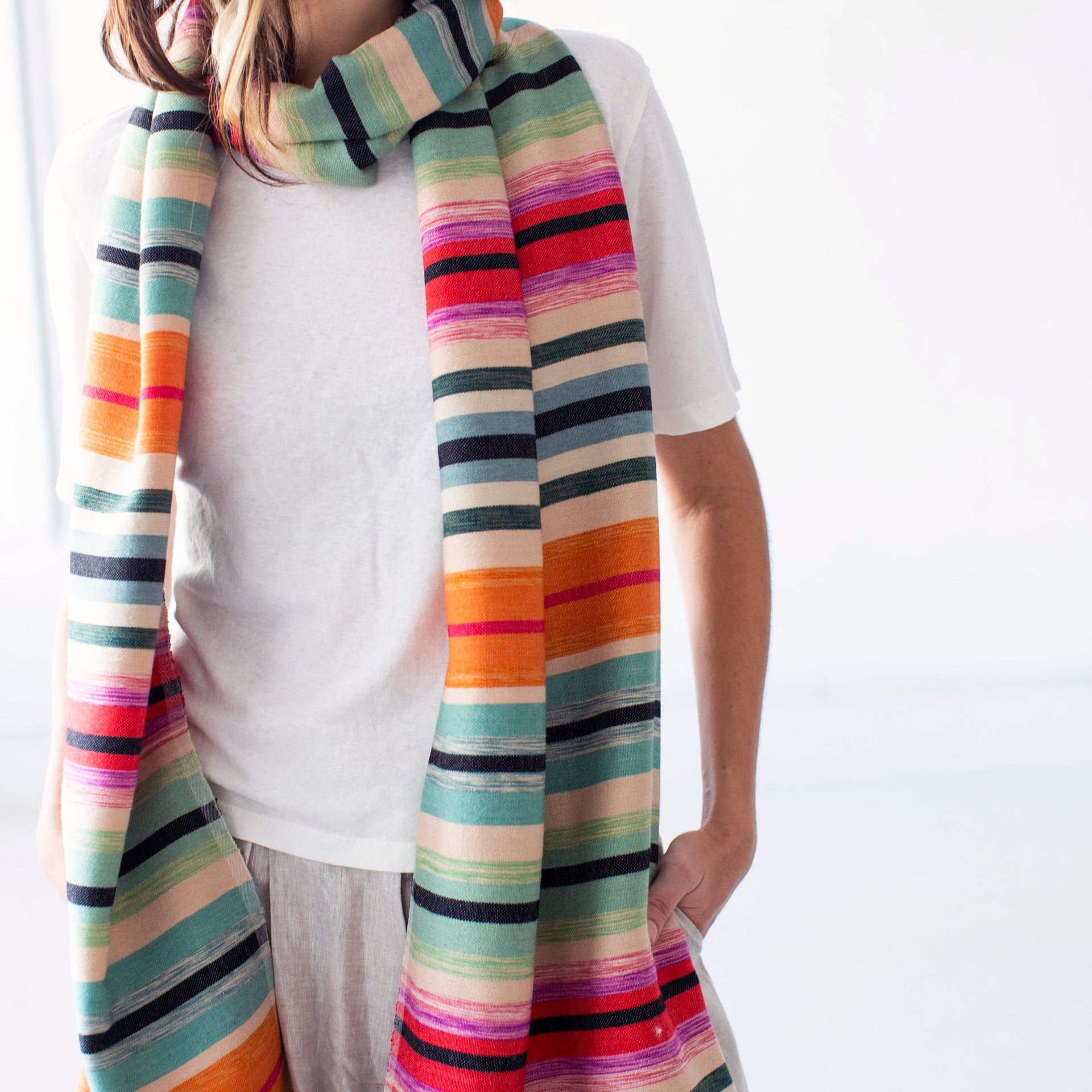 Our Khadi desert scarves are hand-spun, hand-woven cloths from India through fair trade co-ops, composed of a 90% wool weft and 10% cotton warp. Wool and cotton are first spun into yarn on a charkha, a spinning wheel, and then hand-dyed exclusively for Garza Marfa. The yarn is then woven on a handloom to produce our scarves designed by us in Marfa, Texas.