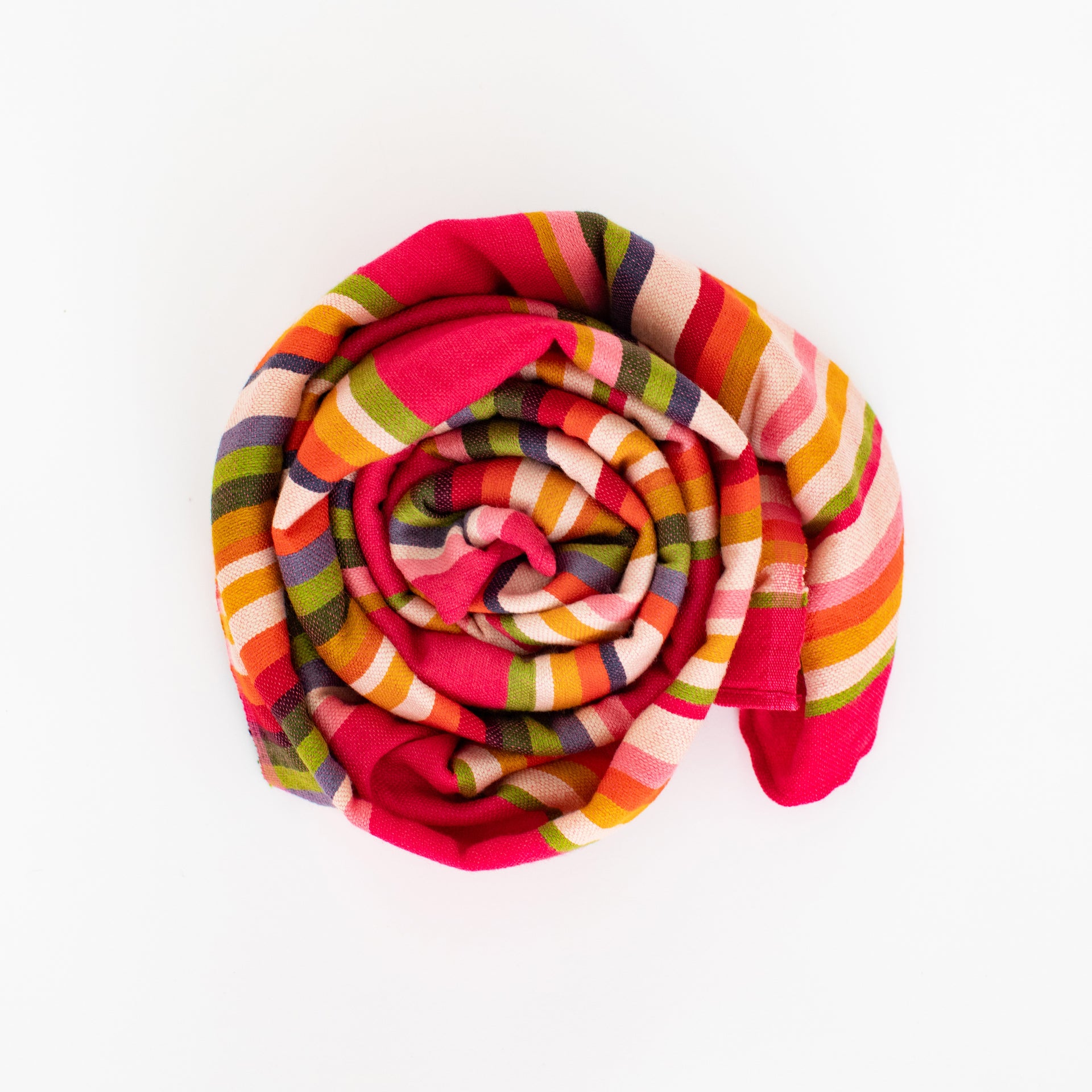 Our Khadi desert scarves are hand-spun, hand-woven cloths from India through fair trade co-ops, composed of a 90% wool weft and 10% cotton warp. Wool and cotton are first spun into yarn on a charkha, a spinning wheel, and then hand-dyed exclusively for Garza Marfa. The yarn is then woven on a handloom to produce our blankets designed by us in Marfa, Texas.