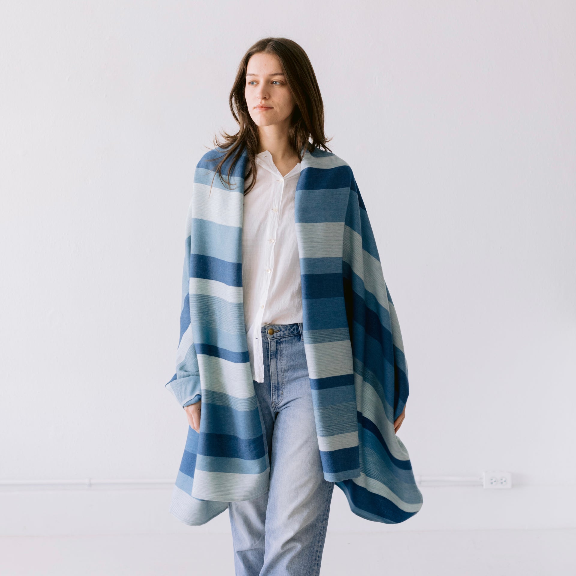 Our Khadi desert shawls are hand-spun, hand-woven cloths from India through fair trade co-ops, composed of a 90% wool weft and 10% cotton warp. Wool and cotton are first spun into yarn on a charkha, a spinning wheel, and then hand-dyed exclusively for Garza Marfa. The yarn is then woven on a handloom to produce our shawls designed by us in Marfa, Texas.