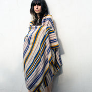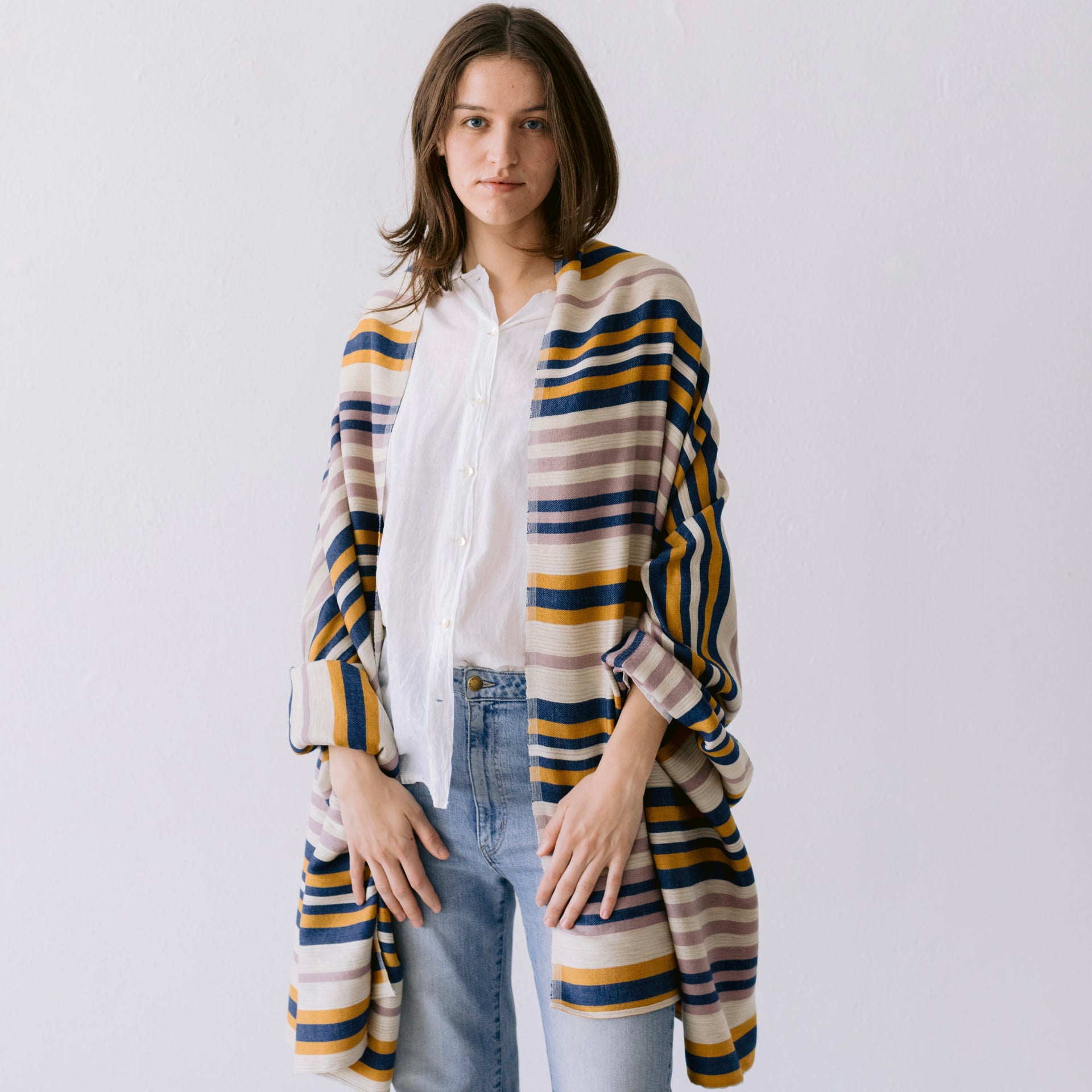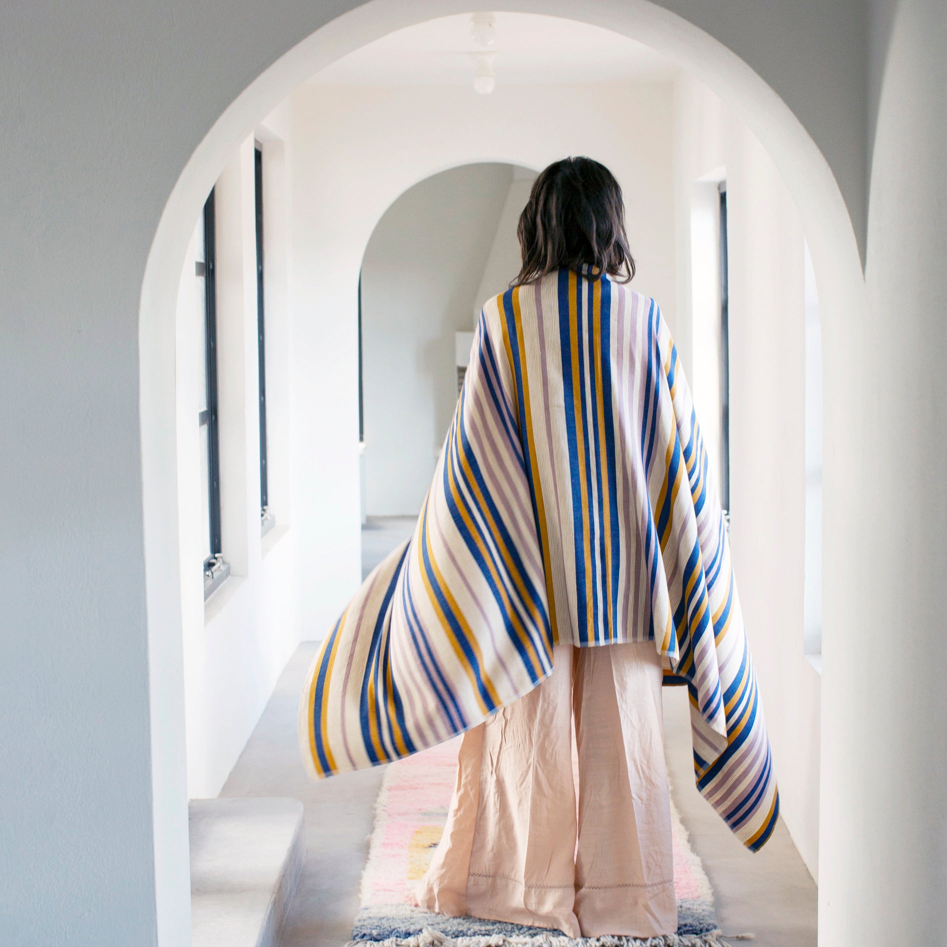 Our Khadi desert shawls are hand-spun, hand-woven cloths from India through fair trade co-ops, composed of a 90% wool weft and 10% cotton warp. Wool and cotton are first spun into yarn on a charkha, a spinning wheel, and then hand-dyed exclusively for Garza Marfa. The yarn is then woven on a handloom to produce our shawls designed by us in Marfa, Texas.