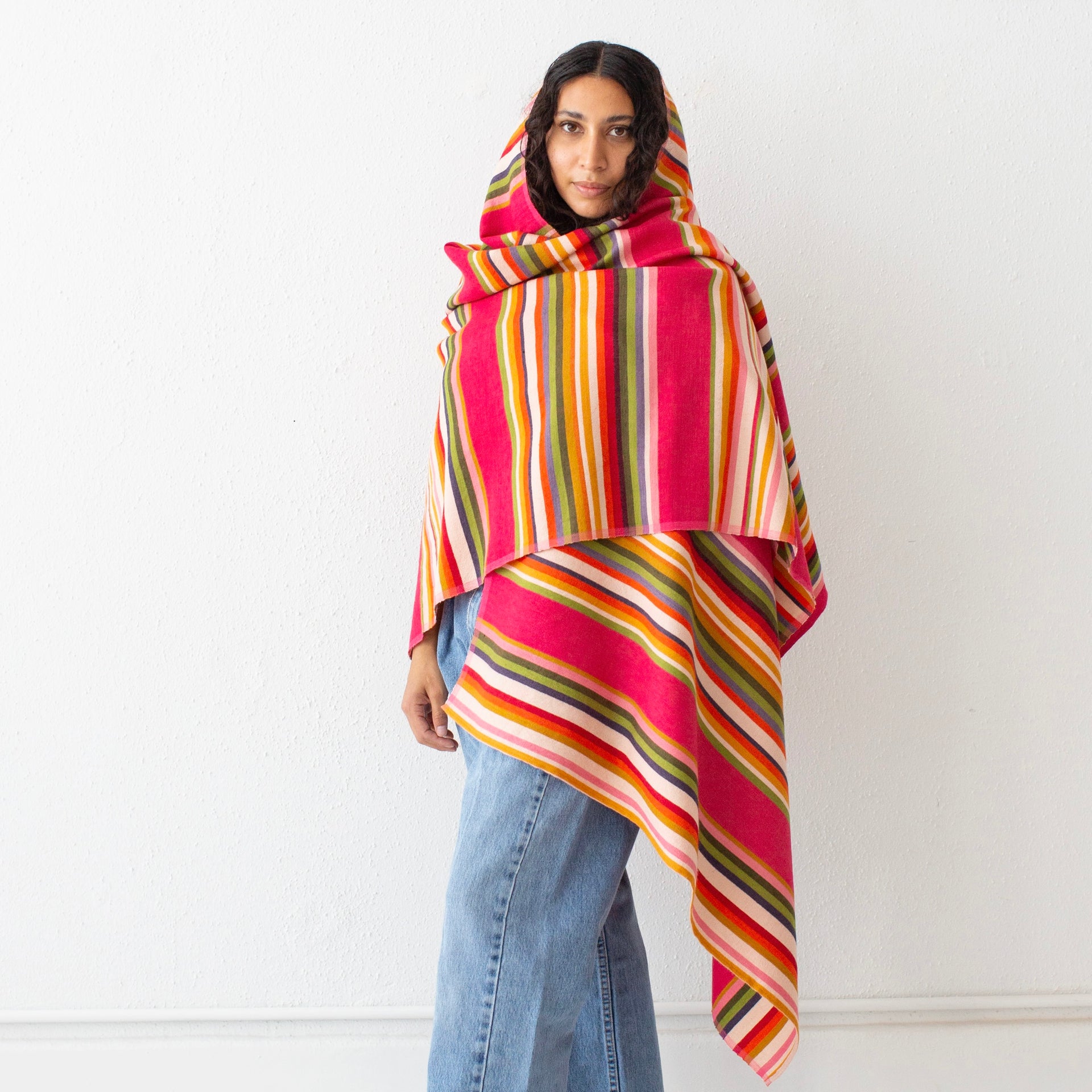 Our Khadi desert shawls are hand-spun, hand-woven cloths from India through fair trade co-ops, composed of a 90% wool weft and 10% cotton warp. Wool and cotton are first spun into yarn on a charkha, a spinning wheel, and then hand-dyed exclusively for Garza Marfa. The yarn is then woven on a handloom to produce our shawls designed by us in Marfa, Texas.