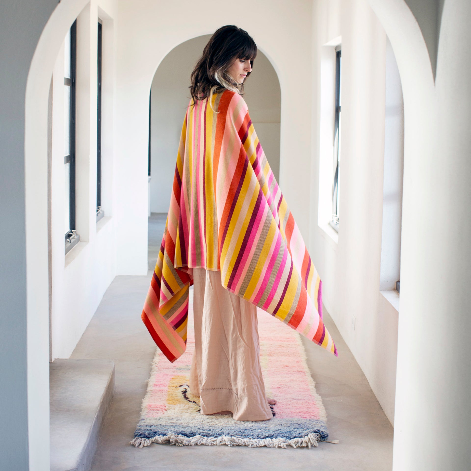 Our Khadi desert shawls are hand-spun, hand-woven cloths from India through fair trade co-ops, composed of a 90% wool weft and 10% cotton warp. Wool and cotton are first spun into yarn on a charkha, a spinning wheel, and then hand-dyed exclusively for Garza Marfa. The yarn is then woven on a handloom to produce our shawls designed by us in Marfa, Texas.