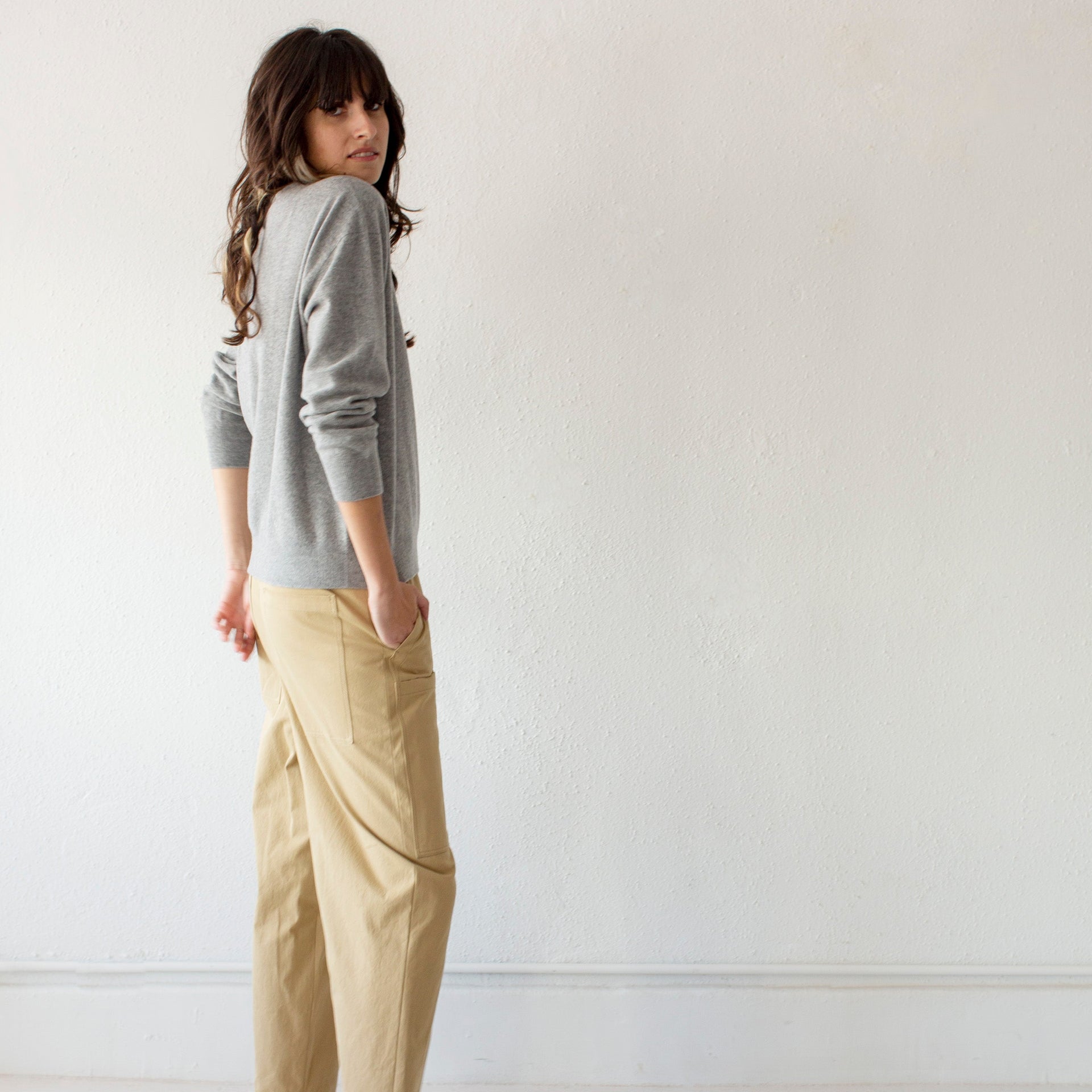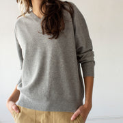 The Ginny sweater in gray is a midweight V-neck pullover made from fine 15.5 micron merino wool with a cashmere-like touch. Relaxed fit and long sleeve for an effortless and clean look.